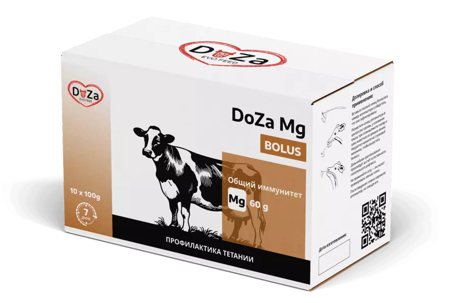 DoZa Магний — болюсная кормовая добавка с высокой концентрацией сульфата магния, предназначенная для профилактики гипомагниемии, тетании и связанных с ними неврологических и метаболических нарушений у крупного рогатого скота. Обеспечивает ударную и пролонгированную доставку магния в организм в течение 2–4 суток.