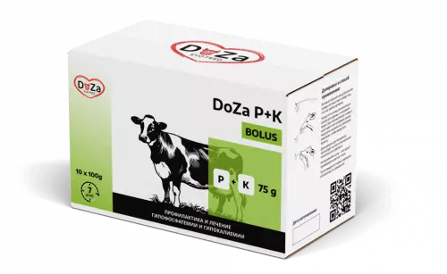 DoZa Фосфор + Калий — это болюсная кормовая добавка, предназначенная для экстренного восполнения дефицита фосфора и калия у коров в послеродовой период. Продукт содержит легкоусвояемую форму дикалийфосфата и способствует восстановлению минерального и энергетического обмена, а также профилактике родильных парезов и залеживания.