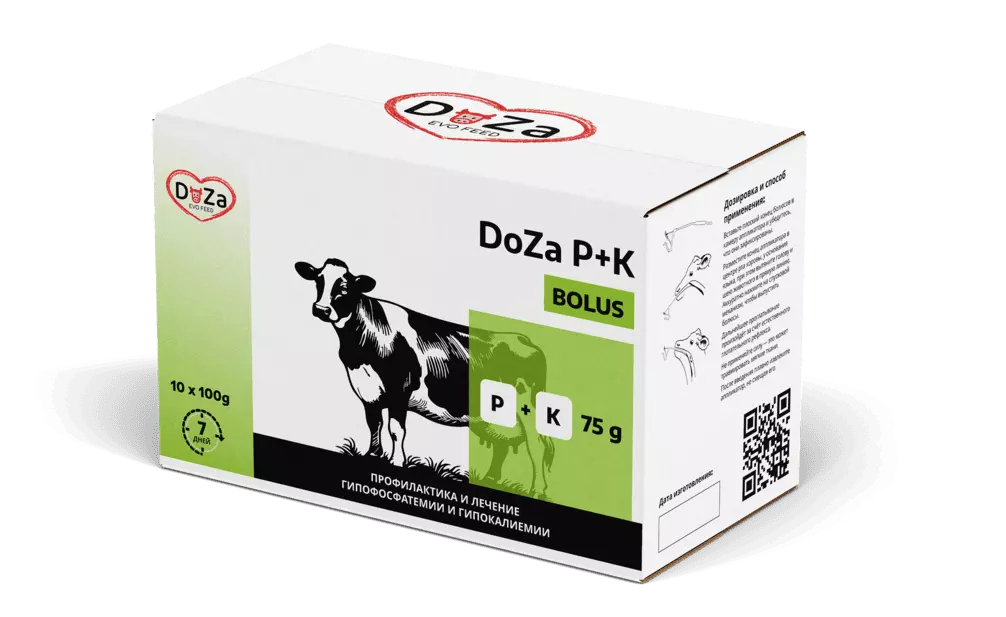 DoZa Фосфор + Калий — это болюсная кормовая добавка, предназначенная для экстренного восполнения дефицита фосфора и калия у коров в послеродовой период. Продукт содержит легкоусвояемую форму дикалийфосфата и способствует восстановлению минерального и энергетического обмена, а также профилактике родильных парезов и залеживания.
