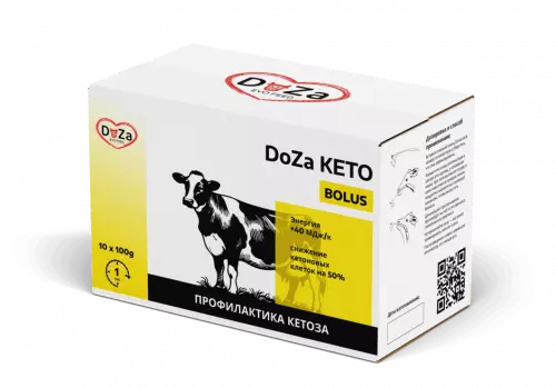 DoZa КЕТО — специализированная болюсная кормовая добавка для профилактики кетоза у высокопродуктивных коров. Содержит пропионат кальция, глюкозу, экстракт артишока и витамин B3 для стабилизации энергетического обмена, защиты печени и предотвращения развития субклинического и клинического кетоза в переходный период.
