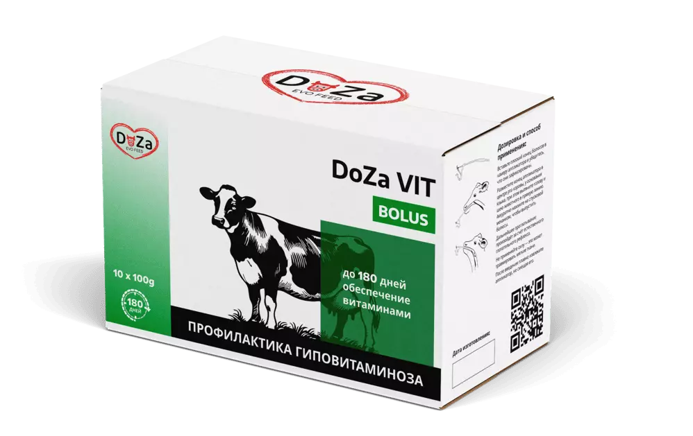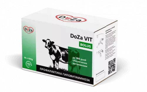 Болюс «Доза Вит» предназначен для крупного рогатого скота в периоды повышенной потребности в витаминах, минералах и аминокислотах: при стельности, лактации, восстановлении после отёла и активном росте. Поддерживает продуктивность, иммунитет и репродуктивные функции.