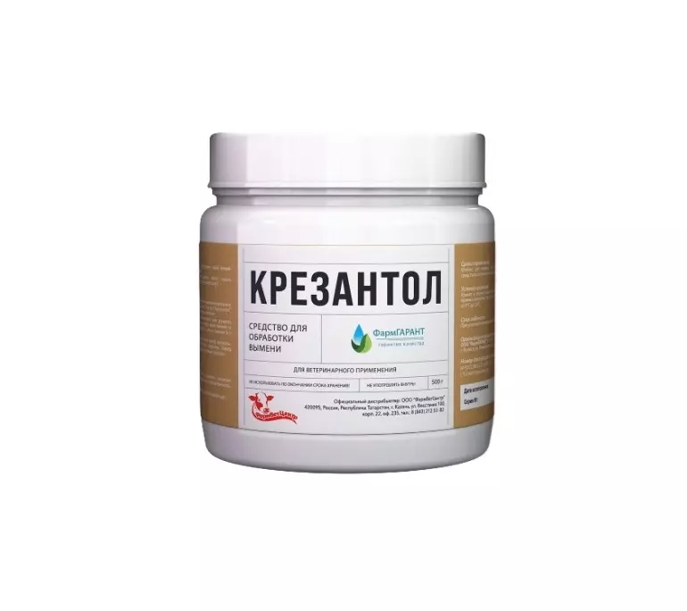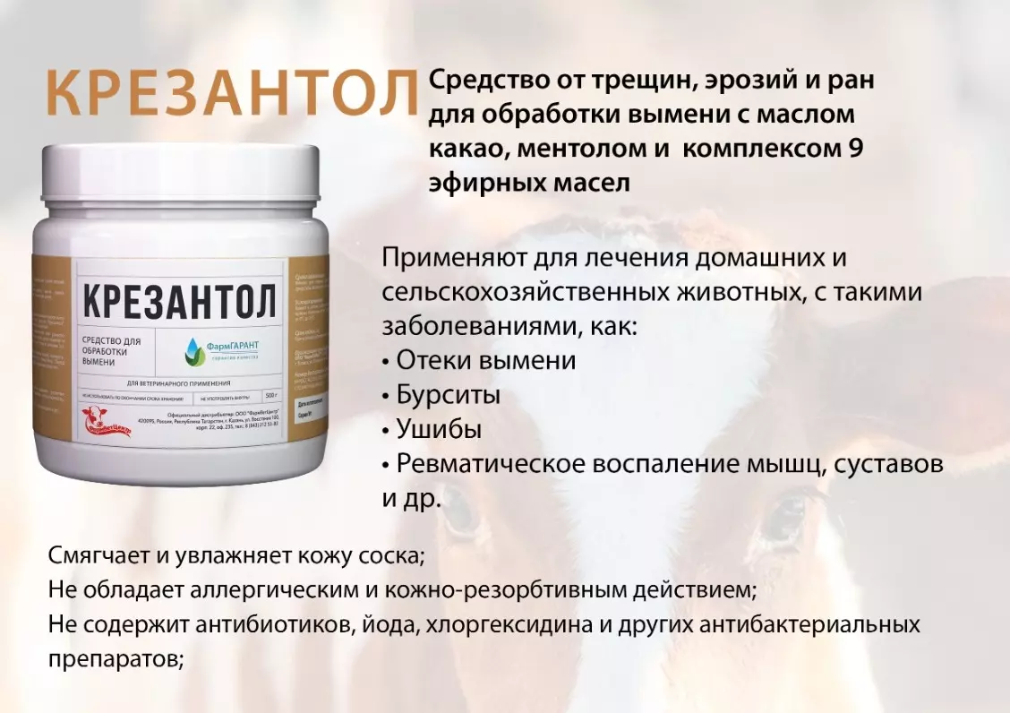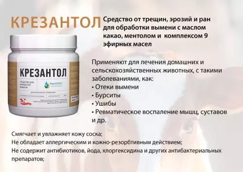 Средства «Крезантол» препятствует проникновению патогенной микрофлоры через сосковый канал, смягчает и увлажняет кожу соска, способствует заживлению трещин и ран вымени.